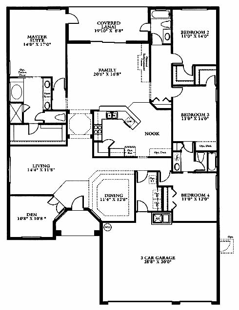 A large family room with covered lanai access is the centerpiece of this home. The nook nearby leads to the kitchen with walk-in pantry and wrap-around counter. A den, living room and dining room surround the foyer entrance. The master suite has a walk-in closet and master bath with tub and separate shower. Three more bedrooms on the opposite side of the home have two baths to provide plenty of privacy. An optional bonus room is available.