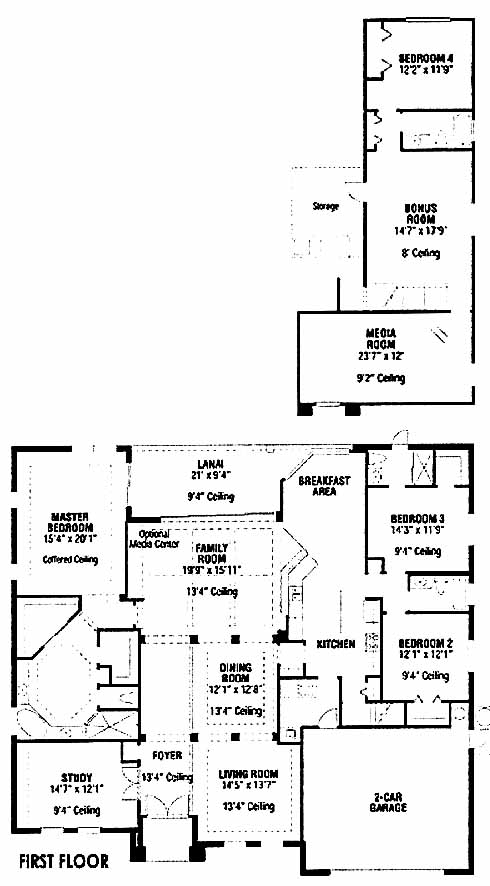 This home has formal living and dining rooms to one side of the foyer entrance. To the other side is the study that makes a great home office. The large family room with lanai access and optional media center is a nice spot to entertain guests. The kitchen has a pantry and island workspace for preparing meals while opening into the breakfast area. The master bedroom includes his and her walk-in closets, private lanai access and a luxurious master bath with dual vanities, soaking tub and separate shower. A second bedroom also has a private bath, making it a nice guest suite. Another bedroom has close access to a bath. The second-floor bonus room makes a nice fitness area or game room.