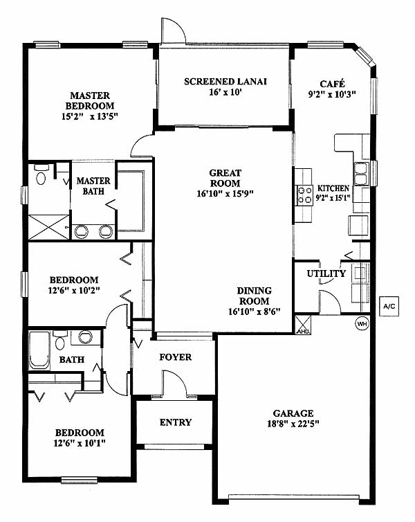 This home has a combined dining and great room area that provides a roomy centralized location that is sure to be the gathering spot for everyone in the family. The kitchen to the right includes ample counter space and has access to the cafe area in the back and the utility room toward the front. Two bedrooms share a bath between, while the master suite has a private bath with walk-in closet and double vanity. Access to the screened lanai from the master suite, great room and cafe area.