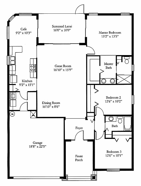 This home has a combined dining and great room in the center of the design. This area will be a great location for entertaining guests and a favorite spot of everyone in the family. Two bedrooms and a bath are accessed from the foyer. The master suite in the back includes a walk-in closet and private bath. The kitchen includes a pantry, ample counter space and opens into the cafe. Access the screened lanai from the great room, master suite or cafe area.