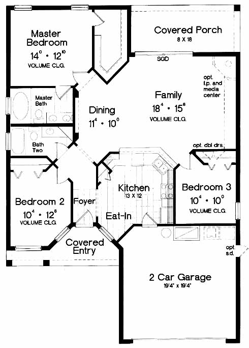 Eat-in kitchen with pantry and wrap-around bartop is located to one side of the foyer entrance. Next is the dining room that overlooks the family room with covered porch access and optional media center available. The master bedroom in the back has an oversized walk-in closet and master bath with double vanity. Two more bedrooms share a bath.
