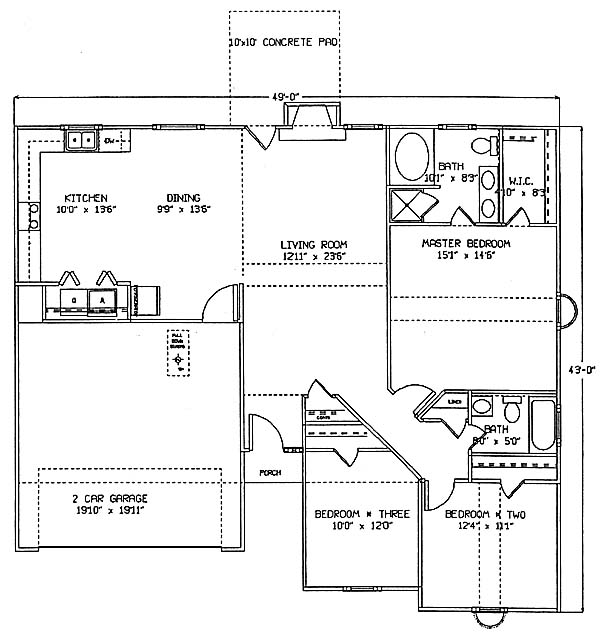 Roomy ranch with huge master suite, and large kitchen with dining area. The living room features a fireplace.