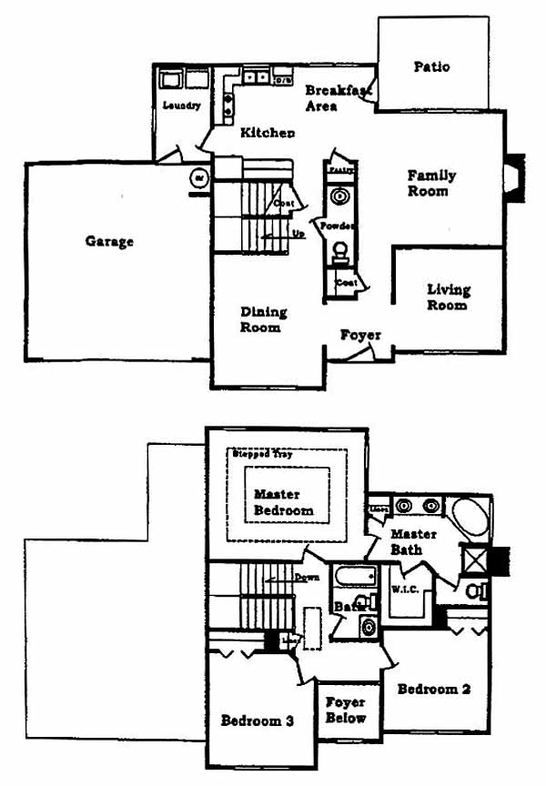 Three bedroom, 2.5 bath plan with 2 story foyer, formal living and dining rooms, family room with fireplace. Large master suite with sitting area.