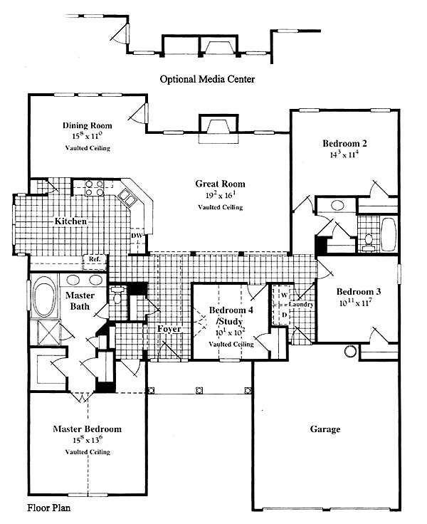 Split floor plan home with expansive columned great room and vaulted living areas and master suite.