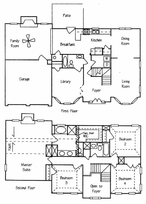 This two-story home has a library and formal living room on either side foyer entrance,, each with an attractive bay window. A formal dining room in the back leads to a kitchen with pantry and ample counterspace. The breakfast room has access to the patio while overlooking the family room with fireplace. The second-floor master suite with vaulted ceiling includes a walk-in closet, a master bath with double vanity and an optional fireplace available. Three more bedrooms share a bath.