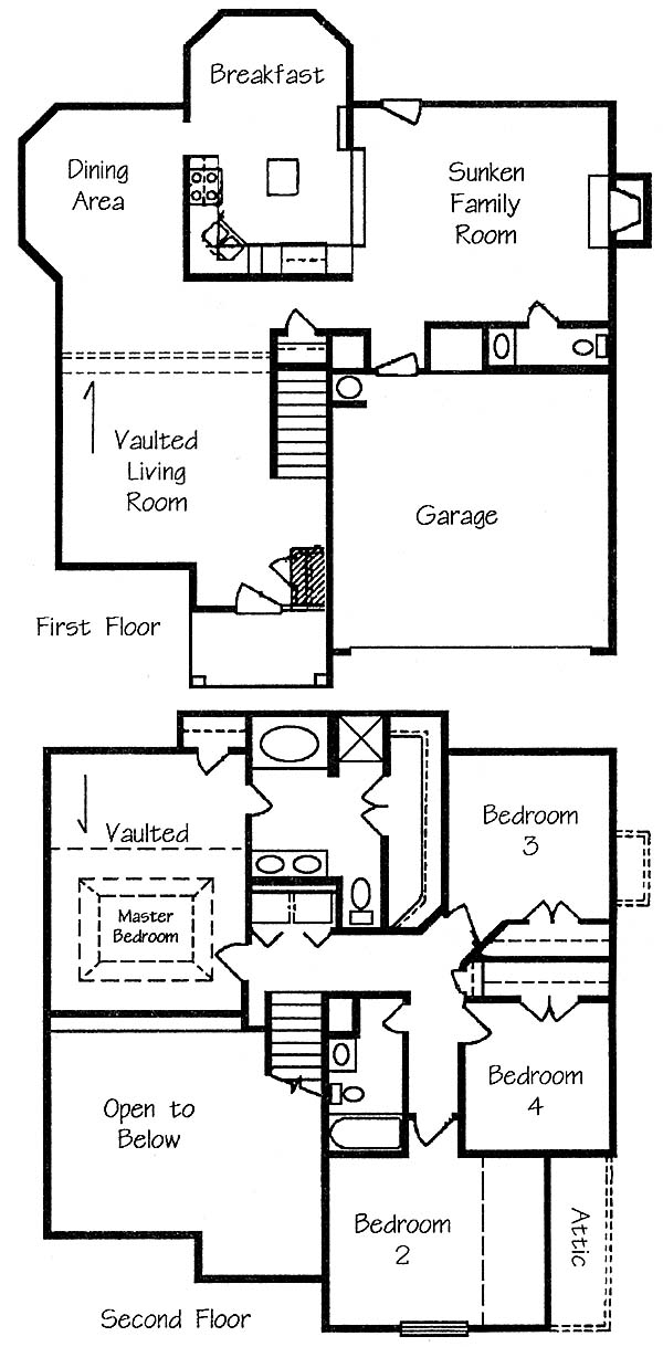 Spacious home with vaulted two-story living room, vaulted master bedroom and sunken family room with fireplace.