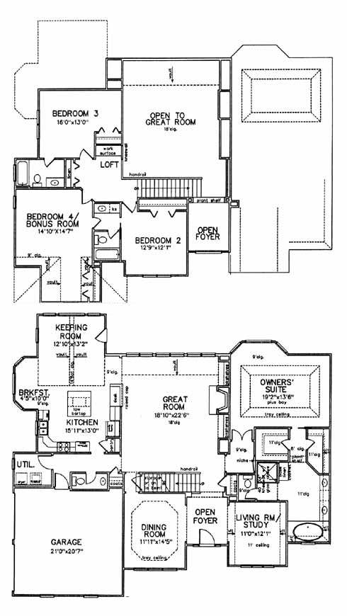 This home has formal living and dining rooms on either side of the foyer entrance. The spacious great room with fireplace and bookshelves will be a popular spot for gathering on the weekend. The kitchen with pantry and island workspace with bartop overlooks the breakfast area and keeping room. The first-floor owner's suite includes his and her walk-in closets and a mster bath with double vanity, tub and separate shower. The second floor has three more bedrooms, including one with a private bath. Views of the great room can be seen below.