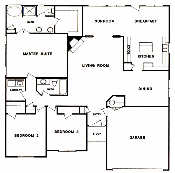 Ranch style home with spacious living room and sunroom, vaulted ceilings, fireplace, spacious island kitchen and formal dining room.