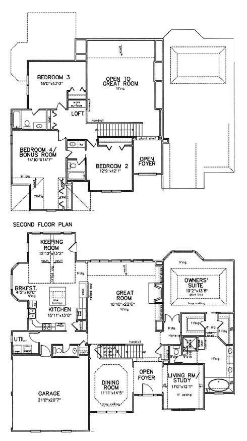 This home has formal living and dining rooms on either side of the foyer entrance. The spacious great room with fireplace and bookshelves will be a popular spot for gathering on the weekend. The kitchen with pantry and island workspace with bartop overlooks the breakfast area and keeping room. The first-floor owner's suite includes his and her walk-in closets and a master bath with double vanity, tub and separate shower. The second floor has three more bedrooms, including one with a private bath. Views of the great room can be seen below.