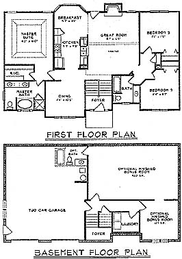 Split bedroom plan with large vaulted great room and spacious master suite. Optional unfinished bonus rooms on the lower level.