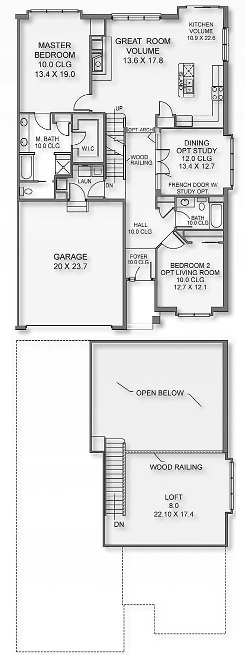 Approximately 2235 sq. ft. First Floor Master Suite with Master Bath; Second bedroom/Optional Living Room; Formal Dining Room/Optional Study; Volume Great Room/Kitchen; Loft/possible third bedroom and third bath; Full Basement; 2 car garage.