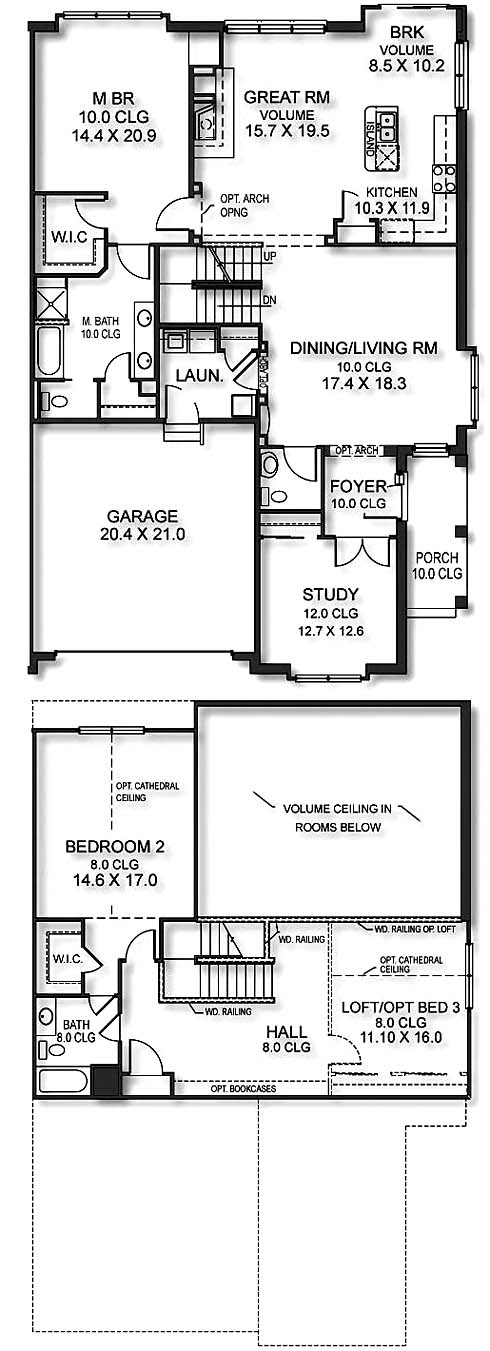 Approximately 2708 sq. ft. First Floor Master Suite with Master Bath; Bedroom 2 on second floor; Loft or optional bedroom 3; Living Room/Dining Room; Volume Great Room/Kitchen; Study on main floor; Full Basement; 2 car garage.