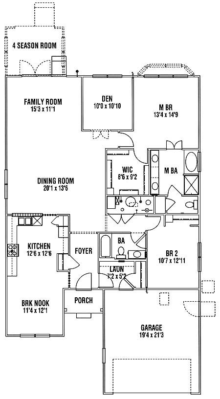 Two bedrooms, two baths, den, family room, dining room, kitchen with nook, laundry/mud room, two car garage.