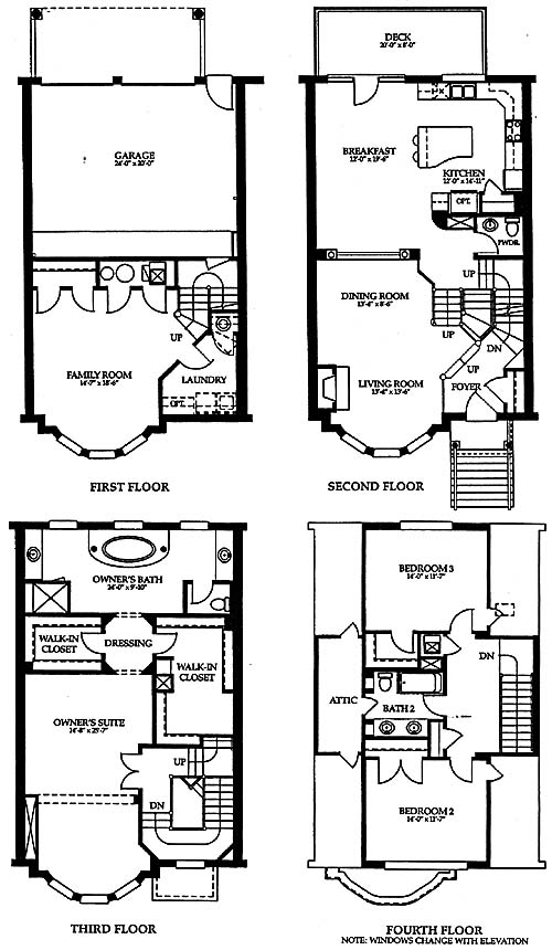 Four story, three bedrooms, two and a half baths, raised entry porch, spectacular foyer, living room with bay window area and fireplace, kitchen, dining room, breakfast area and powder room, rear deck/balcony, first floor family room that converts to a bedroom, laundry area, master bedroom suite with large sitting area.