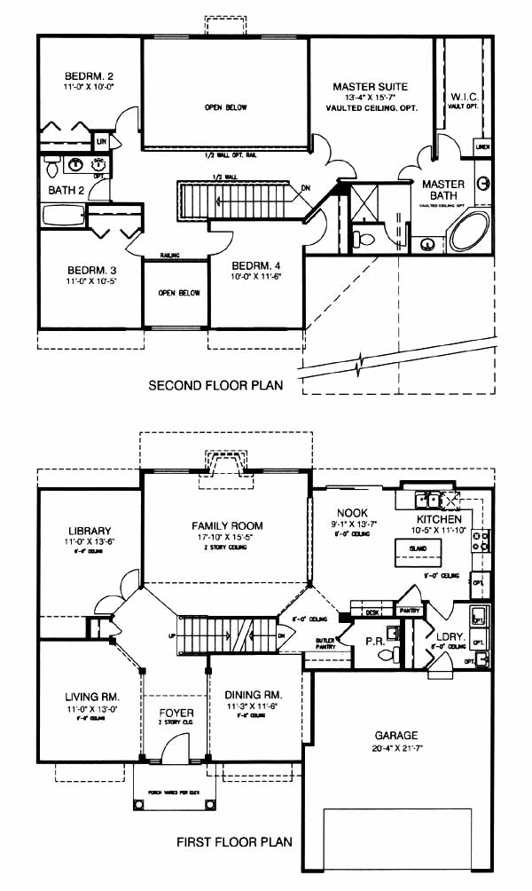 Two story foyer with architectural columns, formal living and dining rooms, library, and kitchen with island, nook, desk and butler pantry. Second floor bridge overlooks the spacious two-story family room. Four bedrooms including deluxe master suite with luxury bath and walk-in closet.
