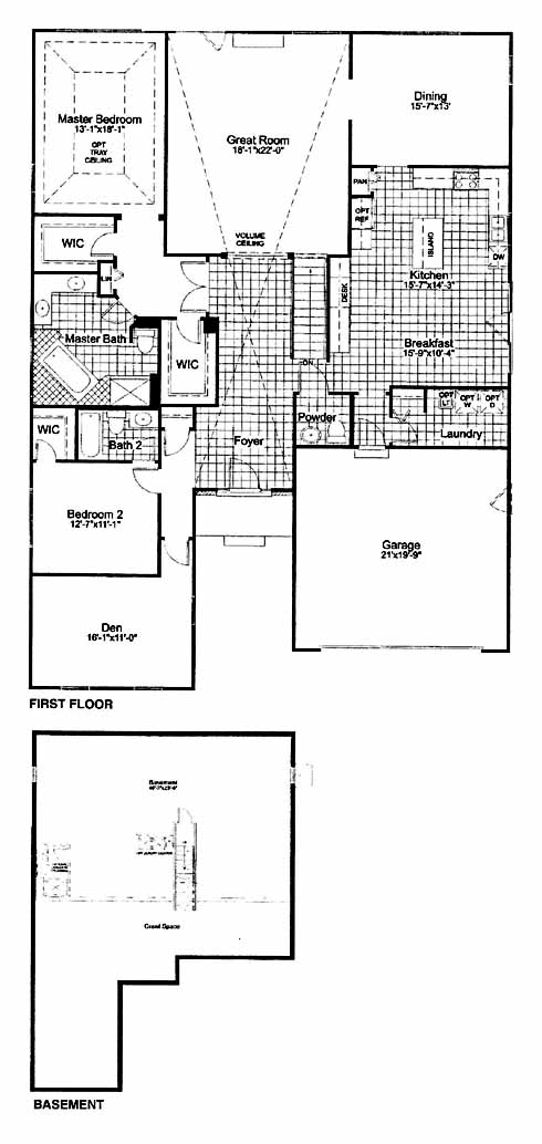 2,449 sq. ft. ranch home with two bedrooms, two-and-one-half baths, two-story foyer, great room, dining room, den, kitchen with breakfast area, basement and an attached two car garage.