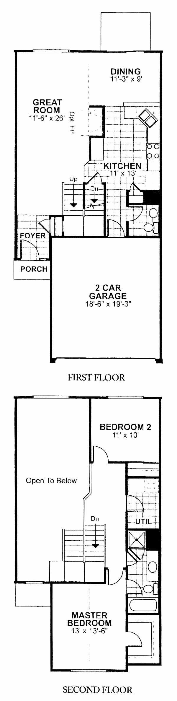 The two-story great room offers an optional fireplace to bring warmth to this already cozy design. Bedrooms are located on the second floor with a walk-in closet in the master bedroom. Design also allows for either an optional loft or third bedroom. The kitchen is spacious and has a corner sink that provides for ample counter space.