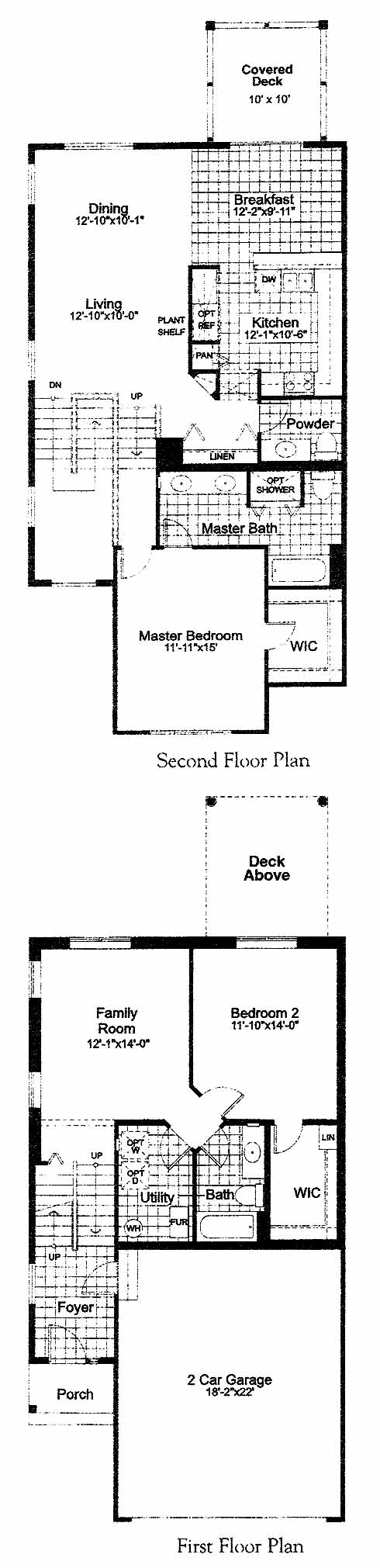 A tri-level Two bedroom, two and a half bath townhome; Master bedroom with walk-in closet and private bath; optional third bedroom; Foyer with volume ceiling; Kitchen with breakfast area; Family room with optional fireplace; Dining/living room with optional fireplace; Deck; Porch; Two-car garage.