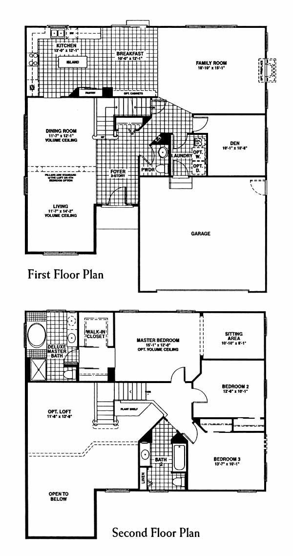 This wide-open three bedroom with first-floor den, 2 1/2 bath home has a two-story bright formal living room and dining room separated by architectural columns; an expansive kitchen with island and roomy breakfast area all open to the family room; first-floor den and laundry room; large master bedroom suite with sitting room; deluxe master bath; basement; and attached two-car garage. a loft that overlooks the living room or fourth bedroom can be added.
