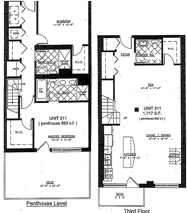 The penthouse unit has an open and spacious floor plan. It has two decks, lots of closet space and high ceilings making this a comfortable place to live. The first floor is reminiscent of a soft loft, and the second floor is divided most similar to a condo with fully divided and private rooms.