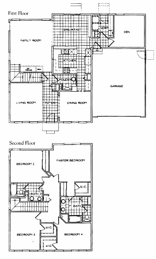 A two-story home featuring four bedrooms plus den, 2 1/2 baths, attached oversized two-car garage, 9-foot first-floor ceiling and partial basement. Formal living room, dining room, den, family room, butler's pantry with adjacent pantry, kitchen with peninsula breakfast counter and breakfast nook. Master bedroom suite with walk-on closet, wardrobe closet and private master bathroom with linen closet and compartmentalized water closet. Three additional bedrooms, two with walk-in closets and one with wardrobe closet. Additional full hall bath with compartmentalized water closet.