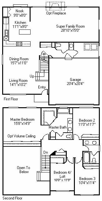 2398 Square Foot: This Two Story home features four bedrooms, 2 1/2 baths, Living Room, Family Room, Dining Room, Large Kitchen with Breakfast Nook, Partial basement and two car attached garage. Options such as Fifth Bedroom, Third bath, Ultra Master Bath, Den, Loft, Volume Ceilings, Fireplace in Family Room and three-car garage are all optional upgrades that are available.