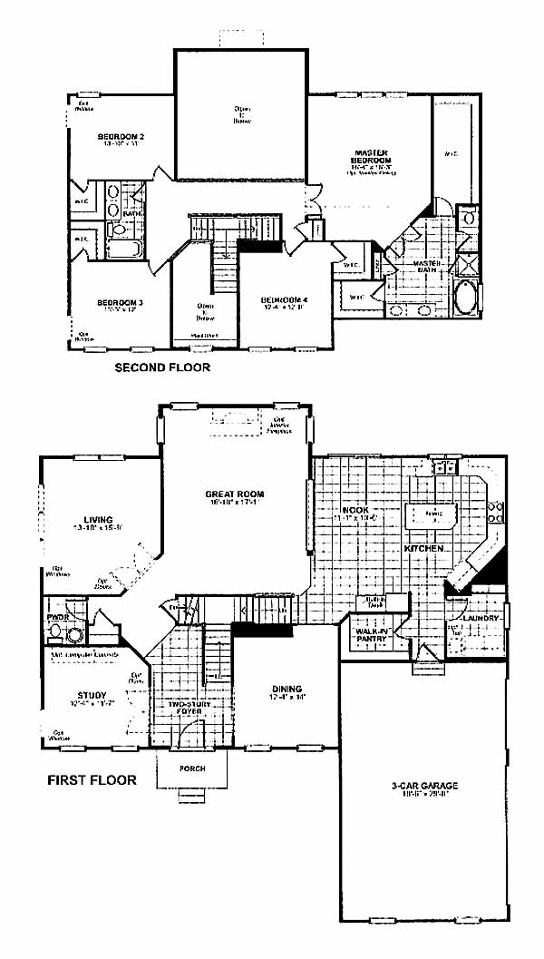 The two-story tiled foyer flanked by the dining room and study takes you past the powder room and living room into the great room with optional interior fireplace. From the great room you can access the tiled kitchen with island, walk-in pantry and breakfast nook. Upstairs you have the 2nd and 3rd bedrooms with walk-in closets, 4th bedroom with walk-in closet and bath, hall bath and the massive master bedroom and bath with walk-in closet and dual vanities.
