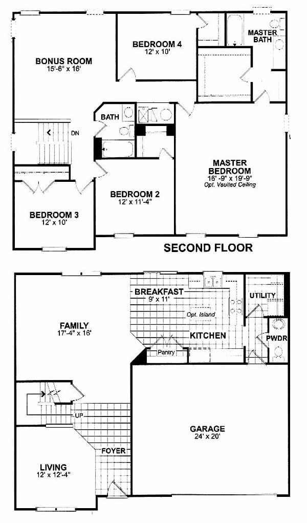 The tiled foyer takes you past the living room and directly into the spacious family room. Open to the family room is the tiled kitchen with pantry, breakfast nook and optional island. On the second floor you'll find the 2nd, 3rd and 4th bedrooms, bonus room and the master bedroom and bath with a walk-in closet.