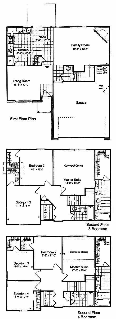Three or four large bedrooms and two and on-half baths highlight this spaciously designed two-story layout. The master bedroom with private bath features the special convenience of an oversized walk-in-closet. A dramatic rear staircase complements the unique character of the family room and spacious kitchen area. Of course, the convenient kitchen area comes with the standard features of solid cherry wood cabinets, overhead fluorescent lights over the sink, self-cleaning oven, sink sprayer and dishwasher. This is truly a floor plan to make everyone in the family feel right at home.