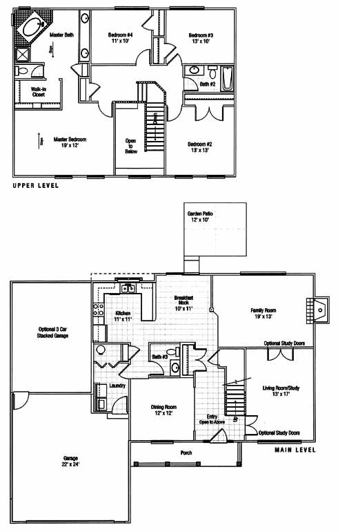 This four bedroom/two and a half bath home features a two story entry, family room with standard fireplace, a large gourmet kitchen and separate breakfast nook. The master bedroom suite includes a sloped ceiling, oversized walk in closet and corner angled garden tub with double vanities and a shower. Many optional upgrades are available to make this plan unique to your lifestyle.