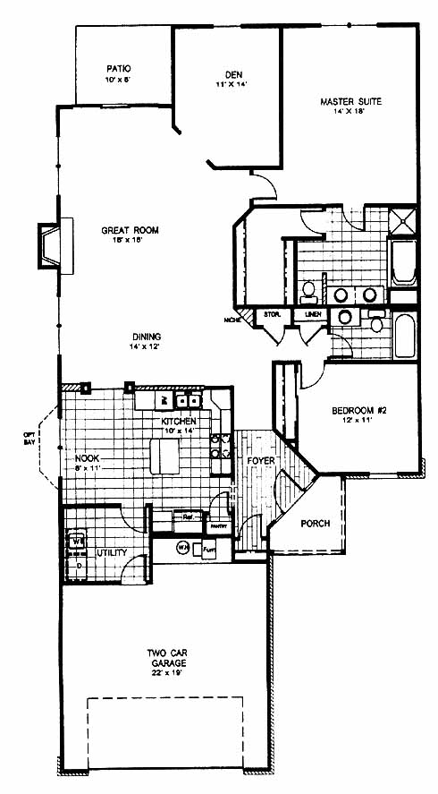 Enjoy this sweeping two bedroom plus den ranch home with dramatic 9' ceilings throughout and oversized great room with a 42 inch gas fireplace. Included are an incredible 18' x 14' master suite with soaking tub and separate shower, walk-in closet and double vanities. The plan features an eat-in kitchen with center island and room for a bay window. A columned dining area completes this functional yet elegant floor plan. Dramatic 9' sliding glass door with transom window leads to a private patio perfect for an optional sun room.