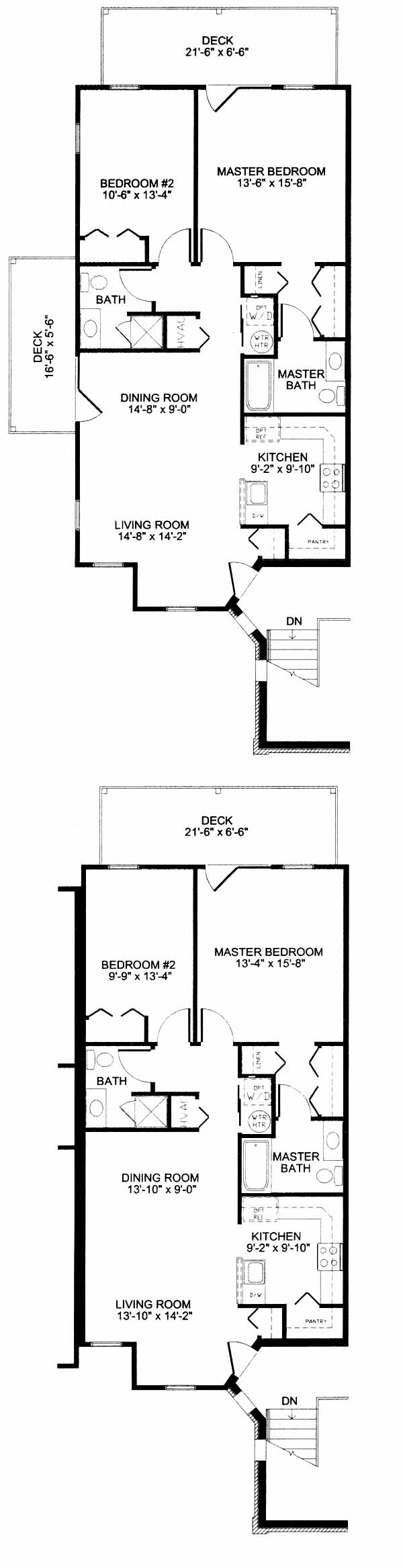 Each condominium has an open living/dining room area, kitchen with pantry, hall bath and bedroom. The condo also has a master bedroom with master bath and linen closet. Each unit comes with at least one deck, or patio if you're on the first floor.