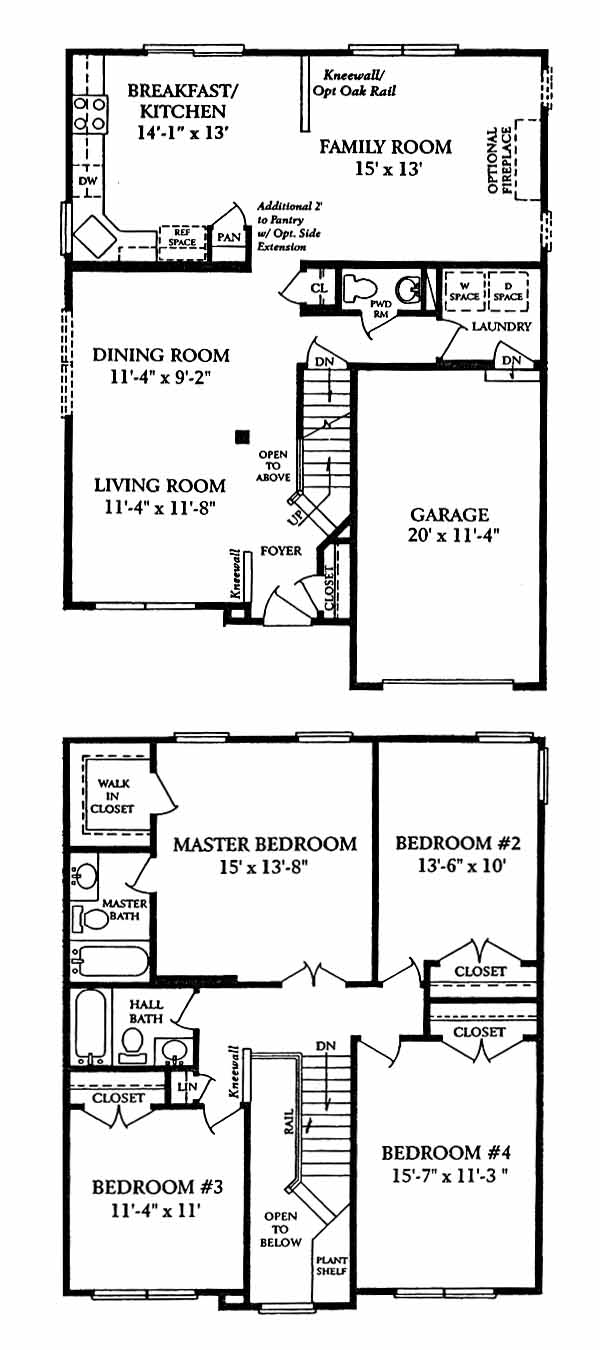This 4 bedroom, 2 1/2 bath home features a foyer that leads into the open living/dining room. With the powder and laundry room down the hall next is the impressive wrap around kitchen with breakfast area and optional bay window. Open to the kitchen is the family room with optional fireplace. On the second floor you'll find a hall bath with 3 bedrooms, linen closet and master bedroom and bath with walk-in closet and optional 2' extension. This house comes standard with a one car garage but is shown here with an optional two car garage.