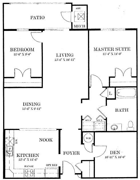 The foyer flanked by the kitchen and den takes you into the large living and dining room area. From here you can access the 2nd bedroom and the master suite and bath.