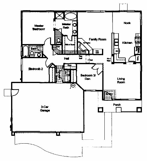 The entry takes you into the large living room. Next you'll come to the kitchen with nook which leads to the family room. Down the hall you have the 2nd and 3rd bedrooms and the master bedroom and bath.