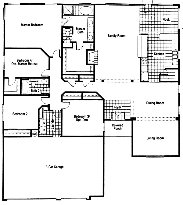A covered front porch leads to the foyer of this one-story home. A family room with fireplace and a living room/dining room space flank a large kitchen with nook. The bedroom area has a retreat and den options. The master bedroom opens into a large bath area with two sinks connected by a vanity with knee space, walk-in closet, a bath tub and shower.