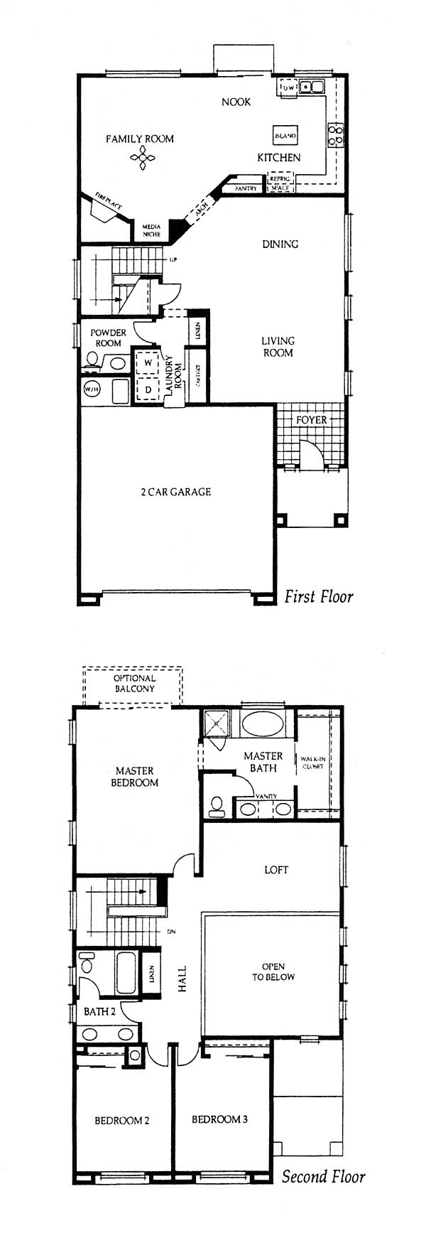 A covered front entry leads into the living room and dining space. Through an arched opening, you enter the family room with corner fireplace and a built-in media niche. The U-shaped kitchen with island opens to a nook. Upstairs there are loft and retreat options in the bedroom areas. The master bedroom has a bath that includes a shower, oval tub, two sinks with vanity between and a walk-in closet.