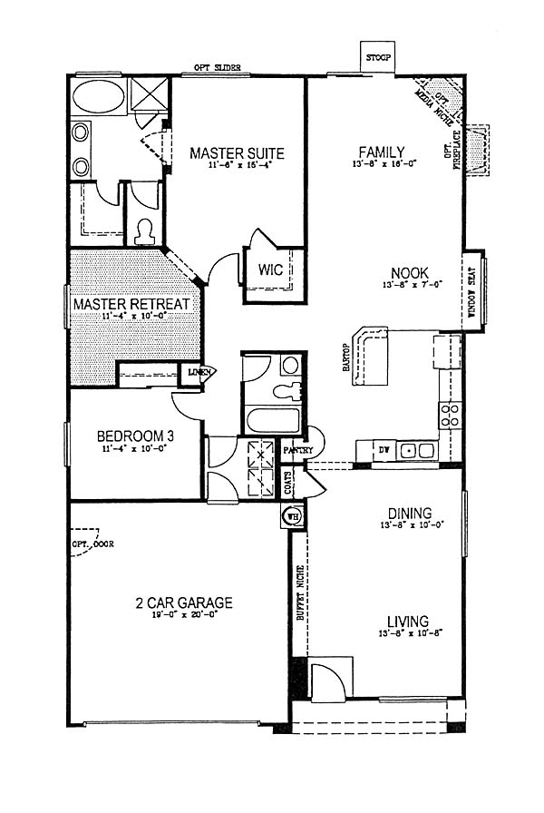 Gable and hip roof elements define this attractive model, helping to protect the front entry. One enters to a living/dining room, and L-shaped kitchen that has an island with bartop, breakfast nook and a family room. The bedrooms include a master suite adjoining its own walk-in closet, tub, shower, two vanities and private commode.