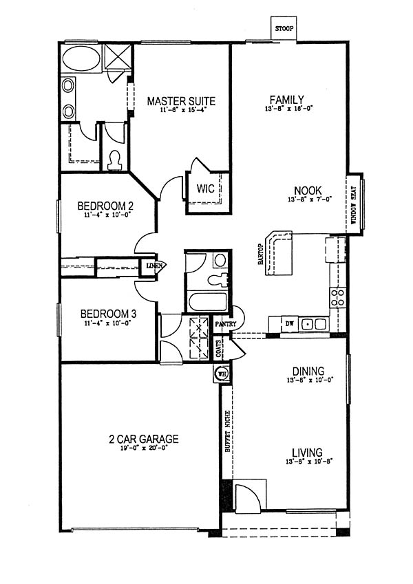 The tiled roof with two triangular hip elements adds beauty to this one-story. You enter to a living/dining room and an L-shaped kitchen that has an island with bartop, to a nook and then a family room. The bedrooms include a master suite adjoining its own walk-in closet, bathtub, shower, two vanities and private commode.