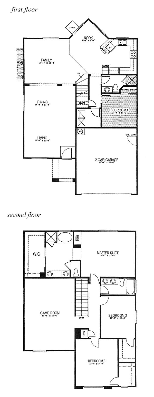 This spacious attractive two-story has a living room, dining room, family room and a kitchen with breakfast bar-top and nook. The third tandem garage is convertible to a downstairs bedroom as modeled. Upstairs, there is a game room and three large bedrooms. Options include extra bedrooms and/or loft. The master bath has a vanity between the sinks, a walk-in closet, a shower and tub.