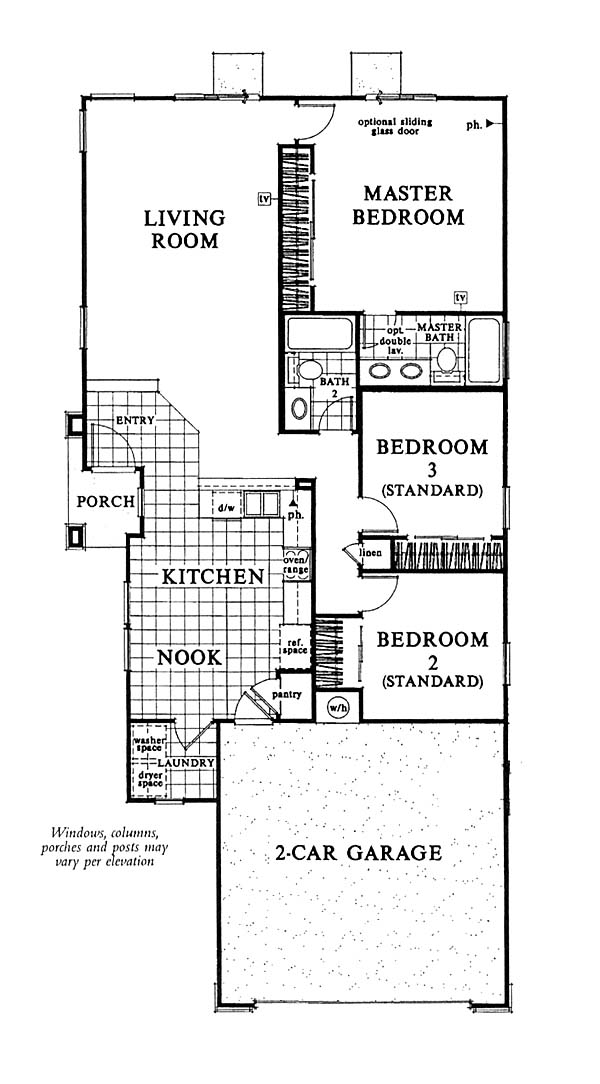 The recessed side entry leads to the living room. The kitchen has a nook and pantry and laundry room. Three bedrooms are standard, but there are a junior master bedroom option and a den option.