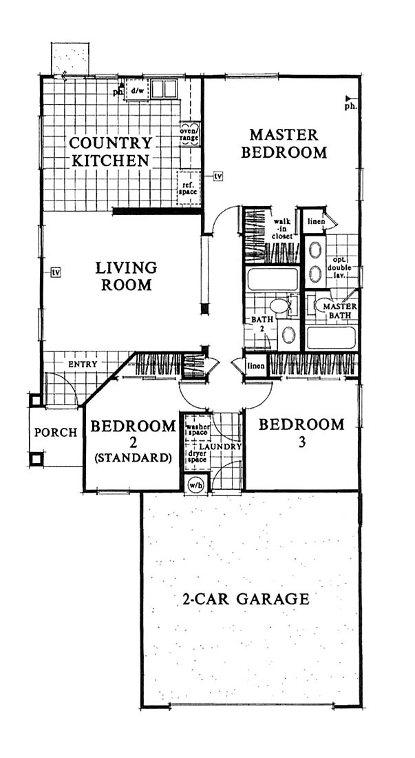 The covered porch leads to the living room and country kitchen. The bedrooms have den options while the master suite has double vanity options.
