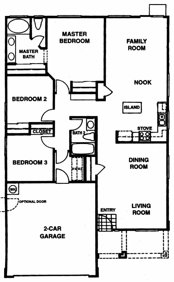 A triangular hip roof above the two-car garage echoes the mountain scape in the distance. Upon entering the tiled foyer there is a combination livin/dining room and just beyond wich lies the L-shaped kitchen with an island opening to an informal breakfast nook and family room. An optional den can be added instead of a third bedroom.