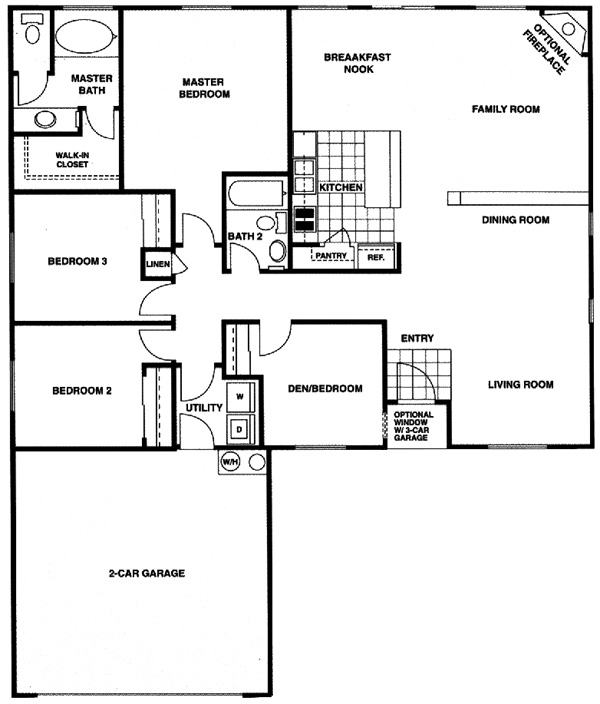 This plan features informal spaces such as the kitchen, breakfast nook and a family room with an optional fireplace. There is also space for a more formal dining and living room. The master bath has an oval tub with a separate commode and walk-in closet.