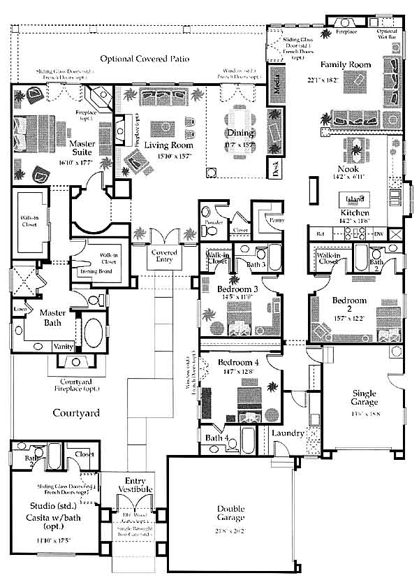 A spectacular entry vestibule opening into a private courtyard exemplifies the space in this magnificent single story home. It Offers discriminating home buyers luxury living with elegant appointments and custom finishes throughout. Many customizing opportunities include numerous floor plan variations, additional fireplaces, spa tub, covered patio, balcony, wet bar, and many other upgrades. On site architects and professional interior decorators are available to assist you in designing your home, and customizing your home to suit your individual tastes.