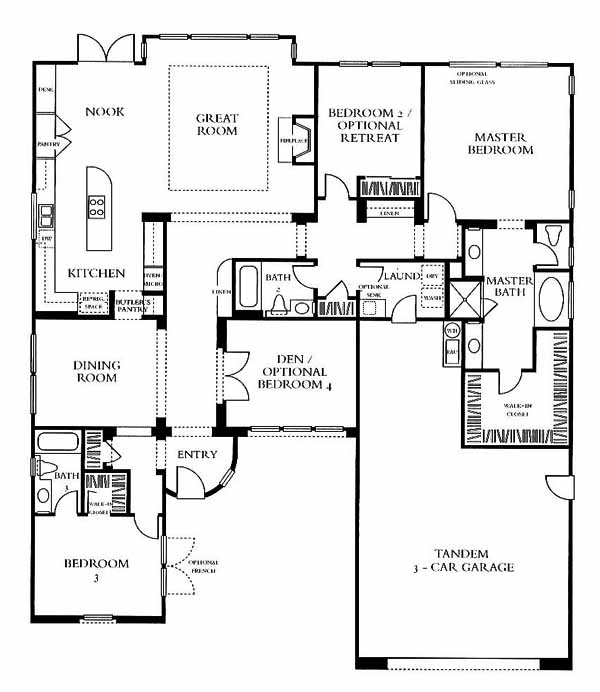 Single story with a dramatic entry. The kitchen features a center island and breakfast nook that opens to the great room with a fireplace. The master bedroom and bath features a garden tub, separate shower and vanities and an oversized walk-in closet. Bedroom two can be an optional retreat. The den can be an optional bedroom number 4.