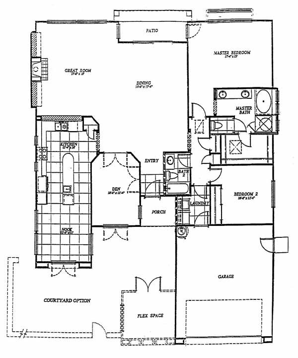 The kitchen features an oversized center island and breakfast nook. The great room features a fireplace and the dining room gives this new home an open feeling. The den is perfect space for an office or crafts. The master bedroom features access to the patio and an oversized walk-in closet through the master bath. The courtyard option and flex space are great for entertaining.