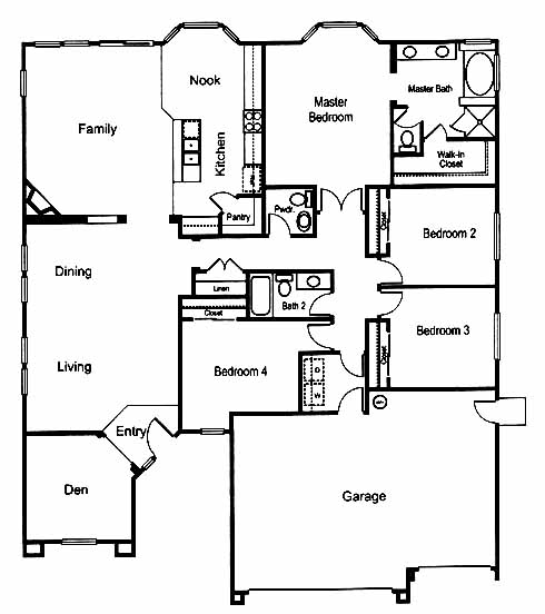 The entry takes you past the den and into the living and dining room area. Next you'll come to the family room which leads to the kitchen with pantry and nook. Down the hall you'll find 3 spacious bedrooms and the master bedroom and bath with dual vanities.