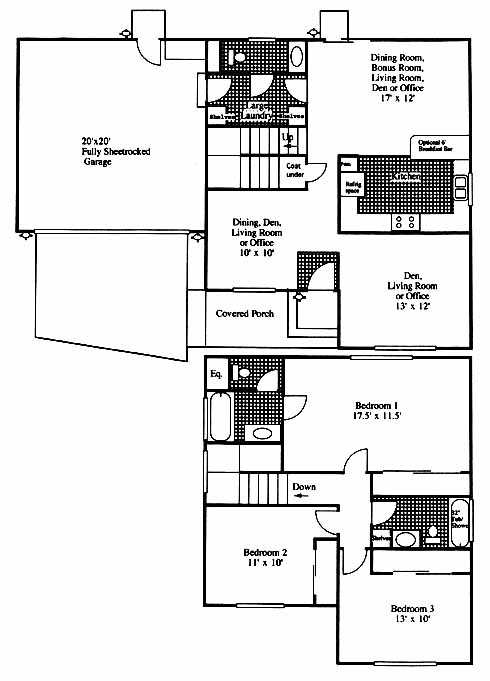 The entry flanked by the living and dining room takes you into the bonus room. Open to the bonus room is the kitchen with pantry. Upstairs you have 2 bedrooms and the master bedroom and bath.