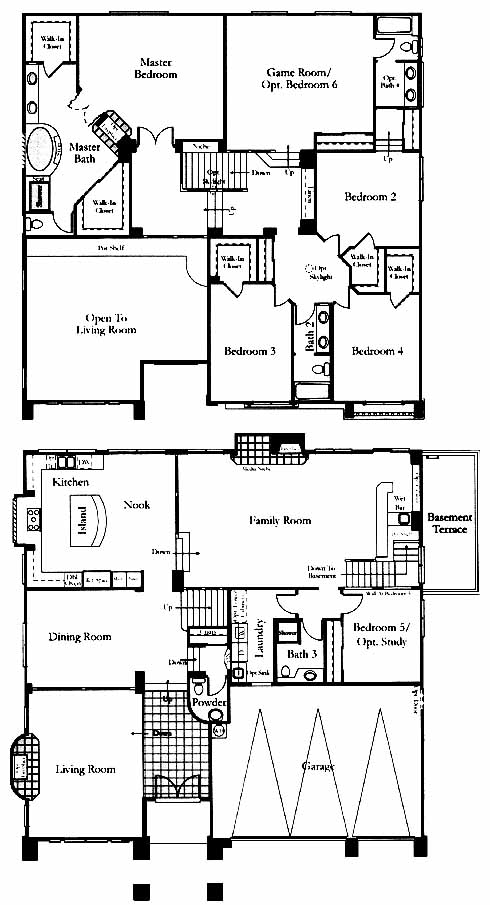 The entry takes you past the living room and dining room just before you come to the kitchen with island and nook. Next you'll come to the family room which access the 5th bedroom. Upstairs you'll find the 2nd, 3rd and 4th bedrooms, game room and master bedroom and bath with dual vanities.